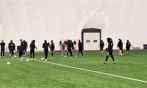 Denna vecka tränar ÖFK i SEP Arena i Krokom. Det är säkert skönt när nordan gör sig gällande.