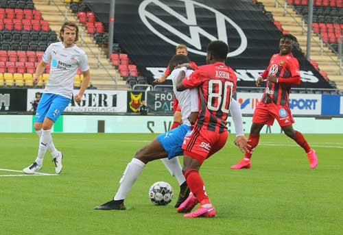 Bilden: Frank Ahrin i närkamp i en match i allsvenskan 2020 mellan ÖFK och HIF som slutade 0-0. Foto: Thord-Eric Nilsson