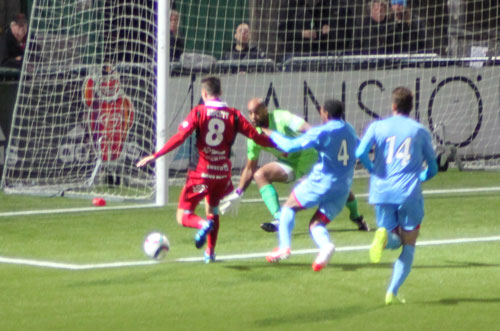 Jamie Hopcutt skjuter och bollen går i mål i vinsten med 3-1 i Superettan mot AFC Athletic den 23 sept 2015. På lördag möts de igen. Foto: Jenny Åhgren |