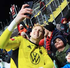 Triisstrean Rasmus Forsell glad över att han hållit nollan och så han kan kosta på sig att ta en selfi när fansen gratulerar honom efter en god match. Foto Thors-Eric Nilsson