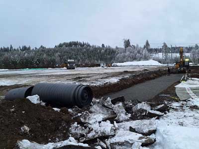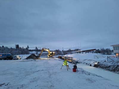 Det går framåt för bygget av fotbollshallen i Krokom. En ram håller på att gjutas för att hålla uppe tältet. Man har nått en långsida och en kortsida. Det blir ungefär halvvägs. Se bilder