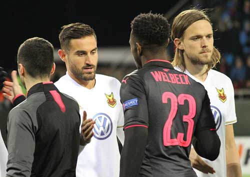 Sotirios Papagiannopoulos och Tom Pettersson i ÖFK hälsar på Arsenals spelare före match. Foto: Thord-Eric Nilsson