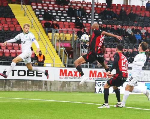 ÖFK:s framstående forward Jabir Abdihakim Ali lyfter högt över marken och tar emot bollen med låret innan han skjuter och gör 1-0 mot Brage. Ögonblicket är fångat av matchfotografen i fotbollz.se Thord-Eric Nilsson. Strörre bild nedan.
